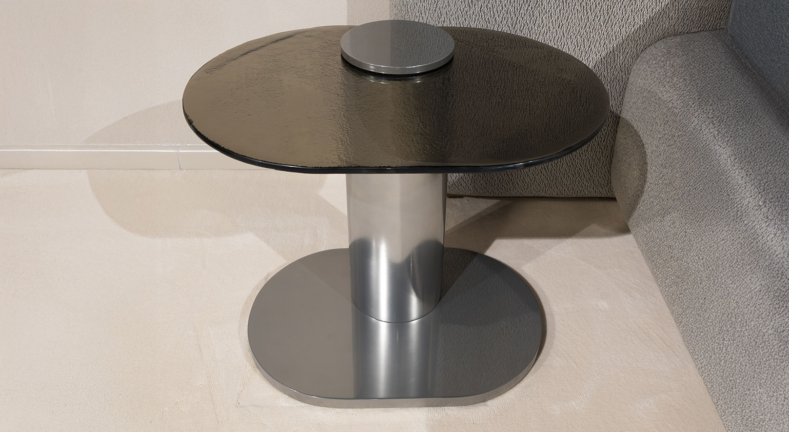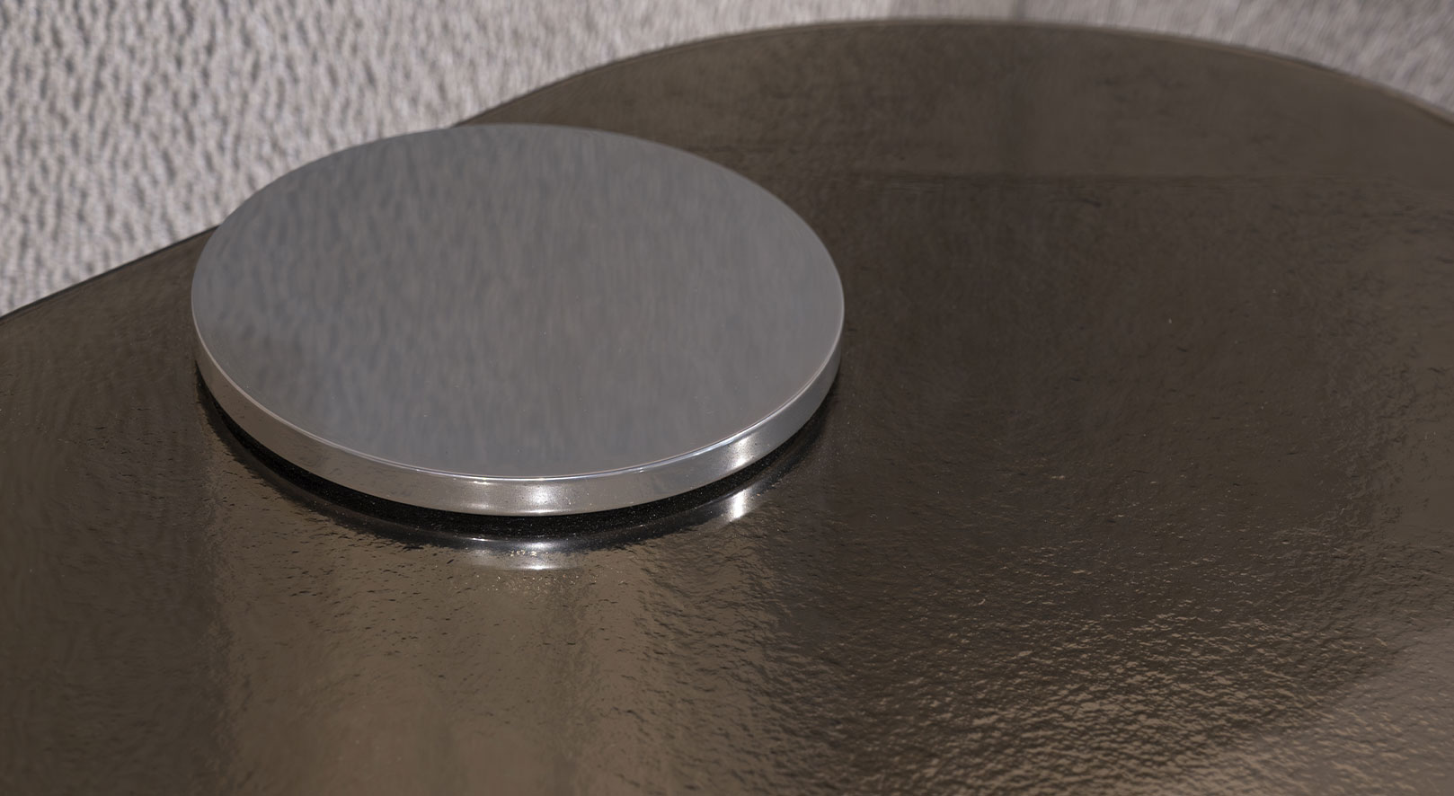 Il piano circolare si appoggia a una base centrale, creando una struttura equilibrata e stabile, capace di dialogare con lo spazio in modo discreto ma deciso.